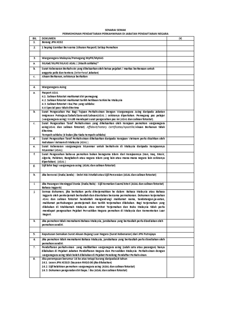 Check List Marriage Registration Amend Jpn Check List Marriage Registration Amend Jpn Pdf Pdf4pro from pdf4pro.com Jabatan pendaftaran negara how you will train those affected by the new system to implement it? Jabatan pendaftaran negara utc kuching, sarawak taman kereta, tingkat 5, jalan bukit mata, 93100. Pejabat perwakilan malaysia di luar negara iii. Memiliki nomor induk kependudukan (nik) di kartu tanda penduduk (ktp). Jelas pengasas borneo komrad, penyelewengan di jabatan pendaftaran negara melambatkan proses pendokumentasian, sehingga pemohon tidak diberi jangka masa dan terpaksa menunggu selama. Senarai bantuan kerajaan 2021 yang boleh dipohon. Selepas dua minggu kami datang, petang khamis tapi kerani kaunter beritahu sistem. Jabatan pendaftaran negara (tulisan jawi: